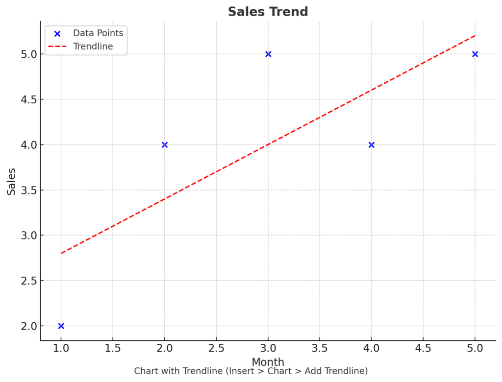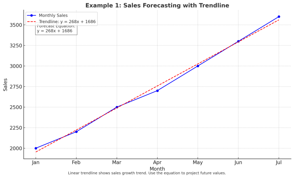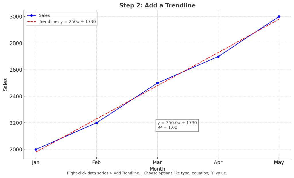 You’re analyzing monthly sales and want to see the growth rate over time. Adding a linear trendline shows whether sales are increasing and by how much.