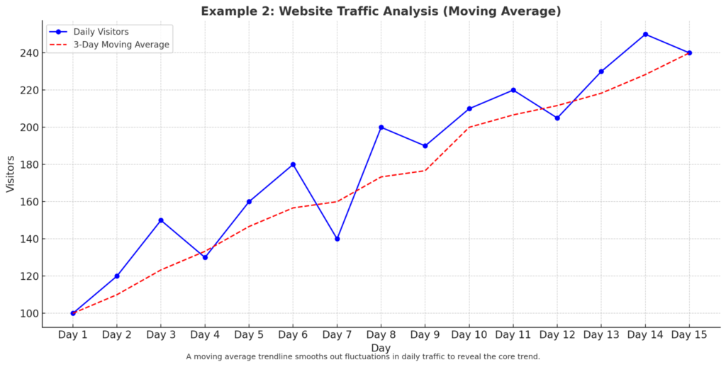 You have daily visitor numbers to your website. A moving average trendline reduces daily spikes. It also reveals the underlying trend clearly.
