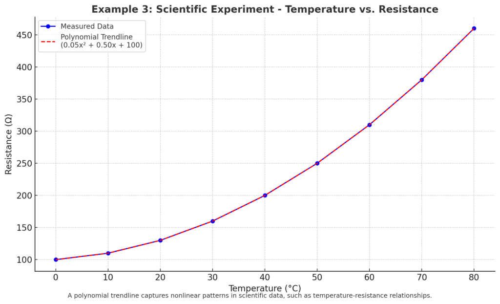 In a physics experiment, you plot temperature vs. resistance. A polynomial trendline helps you see complex patterns and understand how variables relate.