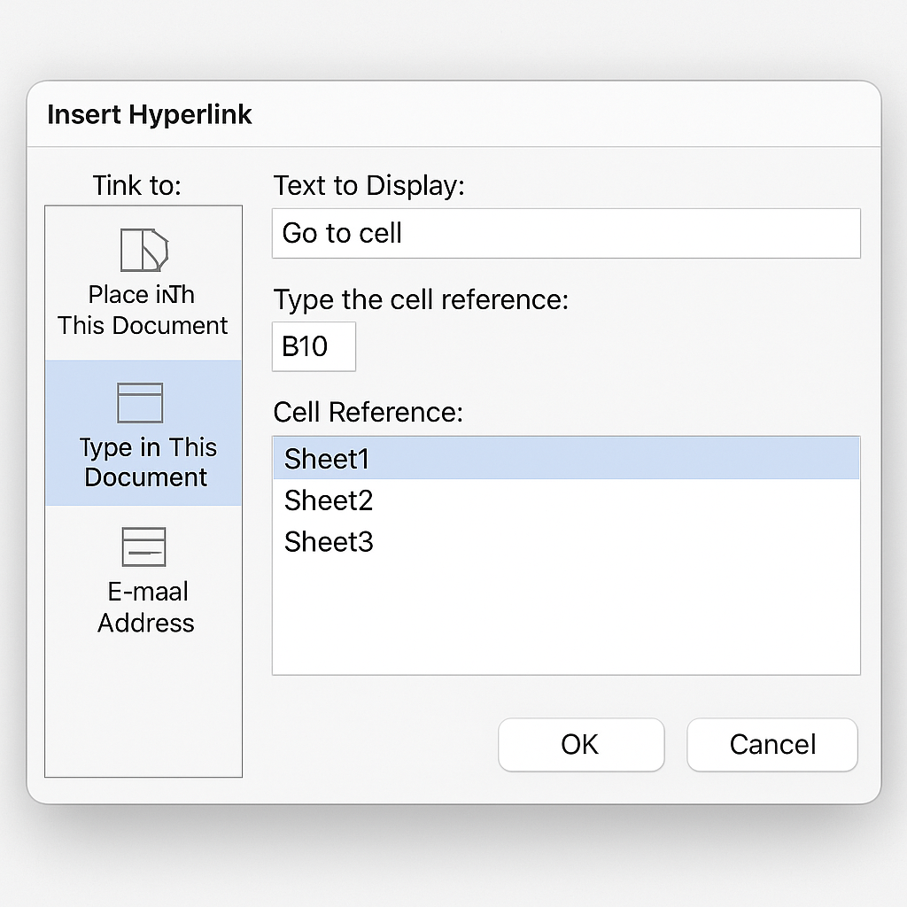 - Choose the sheet you want to link to and type the cell reference (e.g., B10).