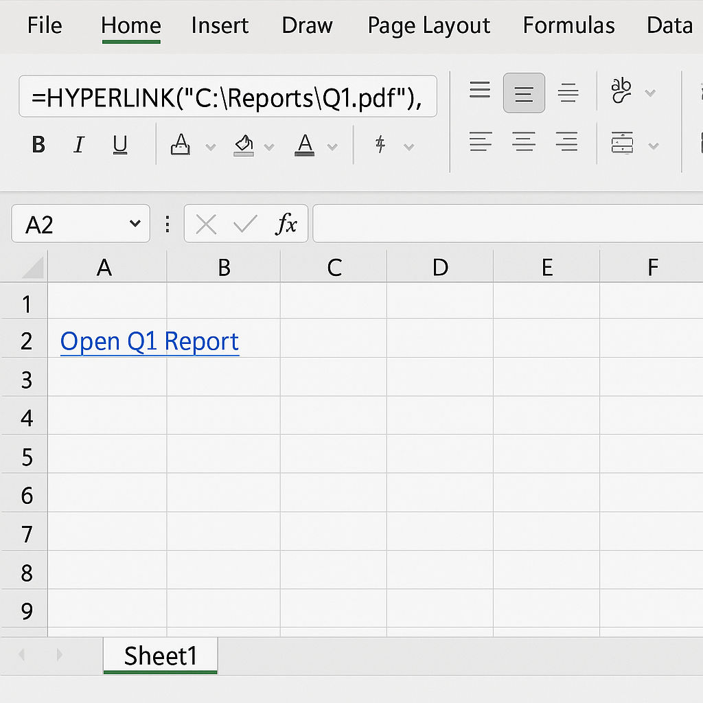 =HYPERLINK(“C:\Reports\Q1.pdf”, “Open Q1 Report”)