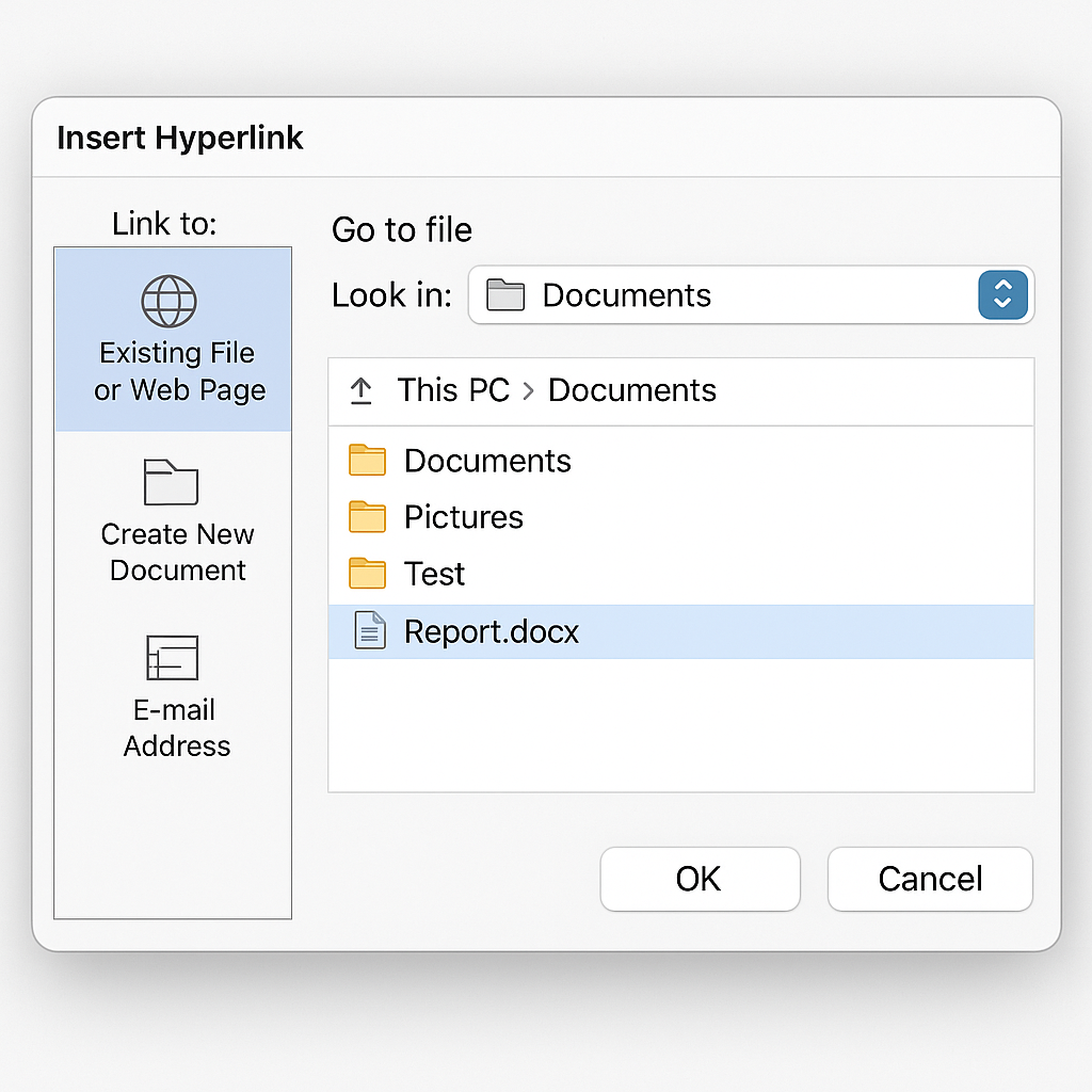- Under “Link to,” select Existing File or Web Page.