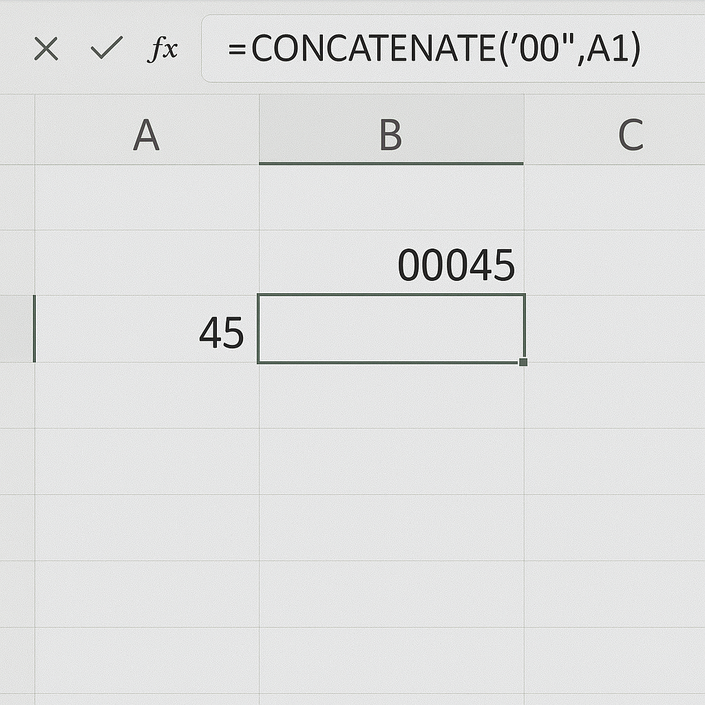 23 | =CONCATENATE(“000”, A1) | 00023 |