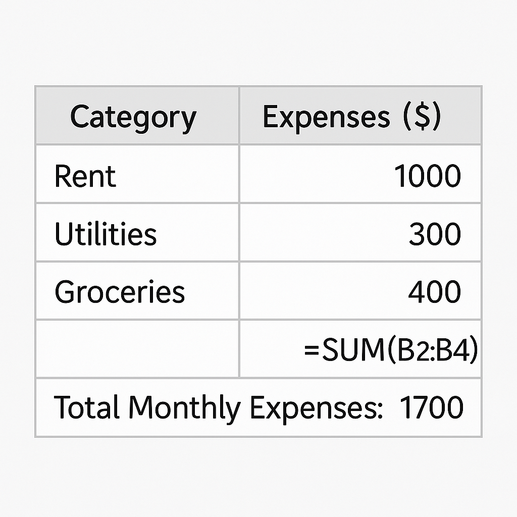 Formula: =SUM(B2:B4) Total Monthly Expenses: 1700
