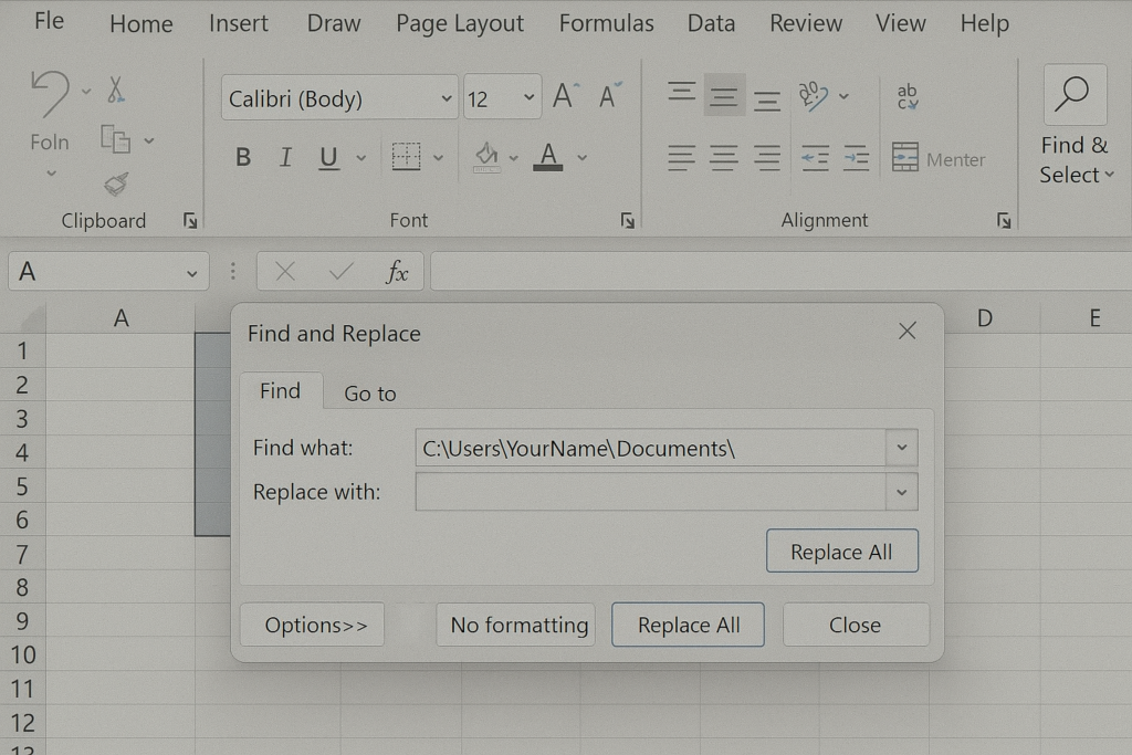 - In “Find what,” type part of the external link path (e.g., C:\Users\YourName\Documents\).