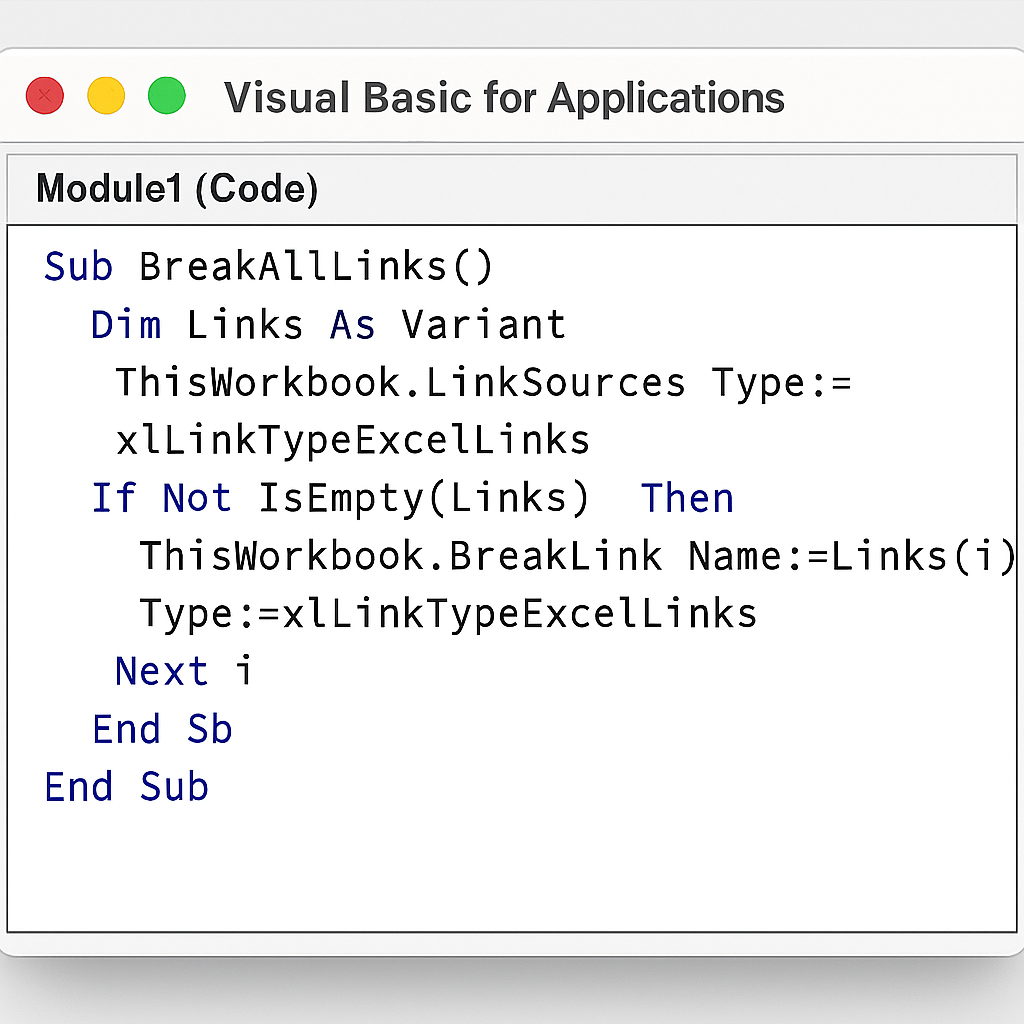 ThisWorkbook.BreakLink Name:=Links(i), Type:=xlLinkTypeExcelLinks