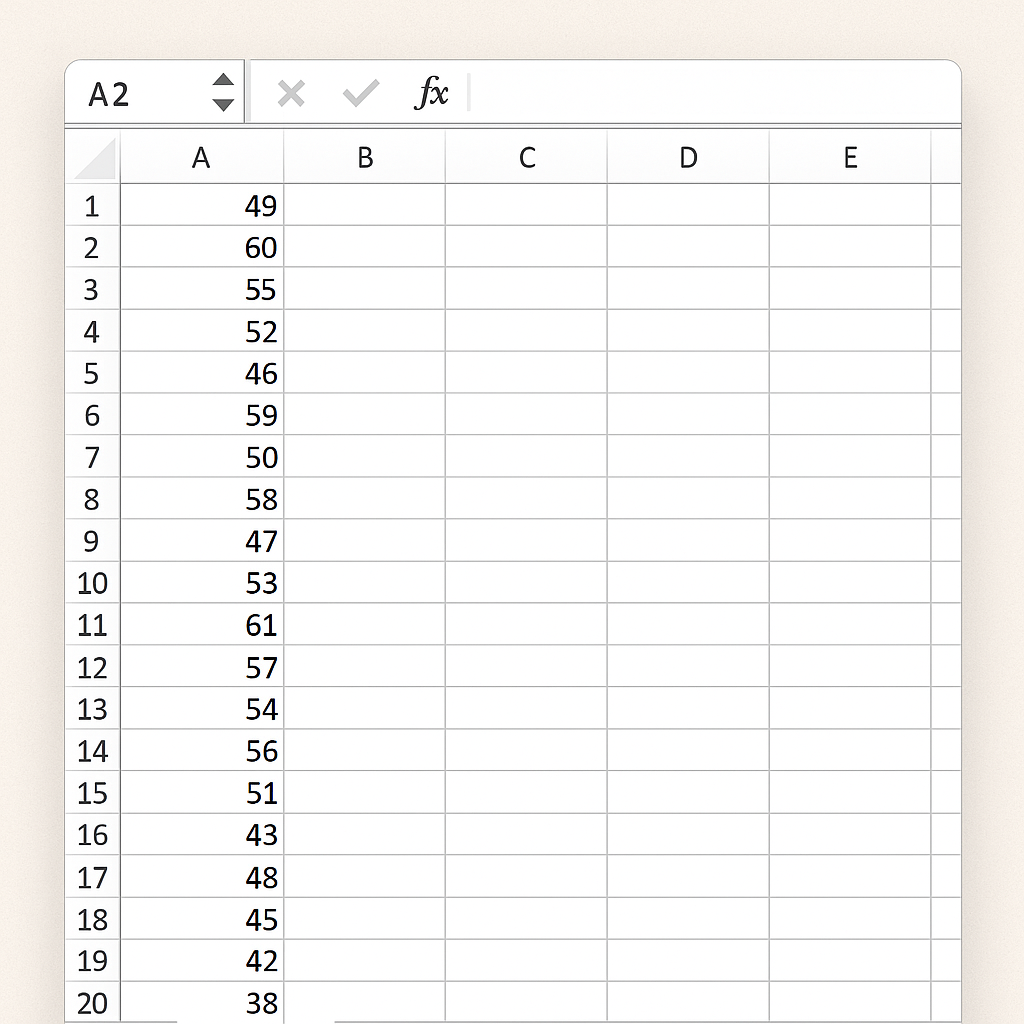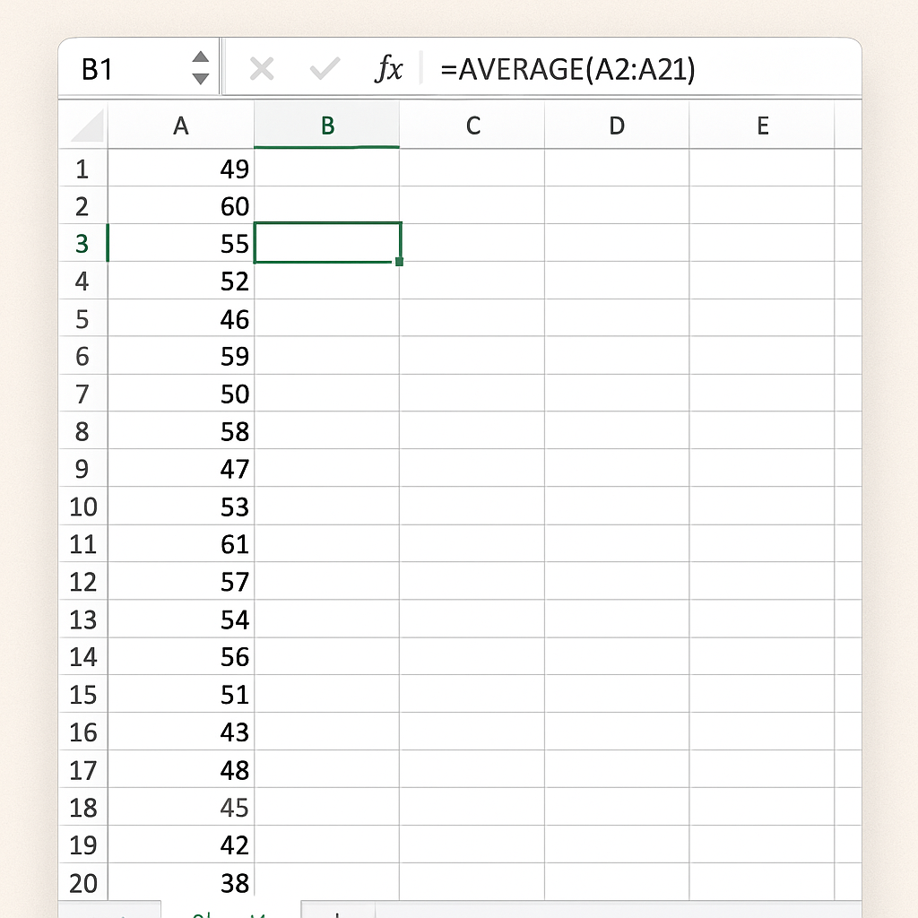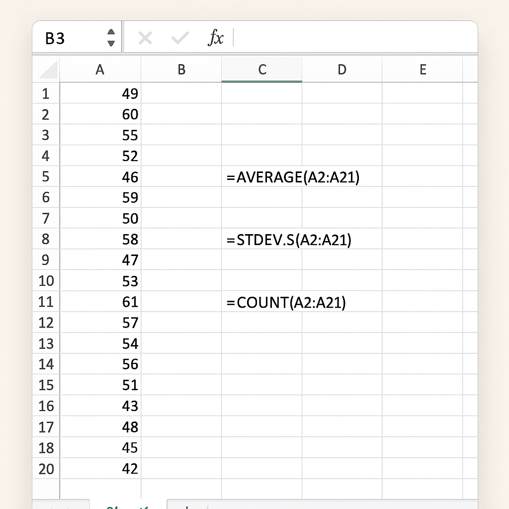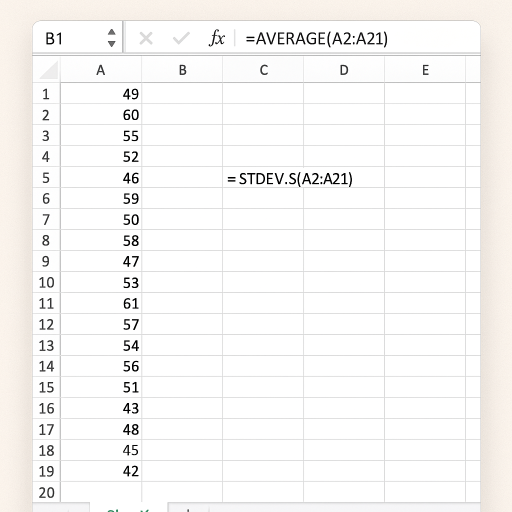 Calculate Standard Deviation (σ): Use =STDEV.S(A2:A21)