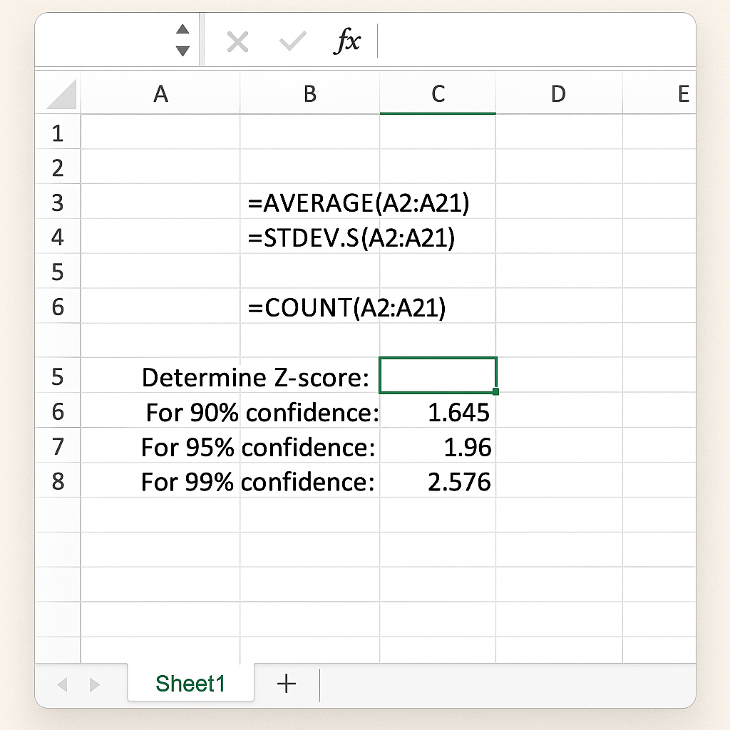 If your sample is skewed or small (n < 30), consider using t-distribution instead of Z-scores. Use Excel’s T.INV.2T() function for this.