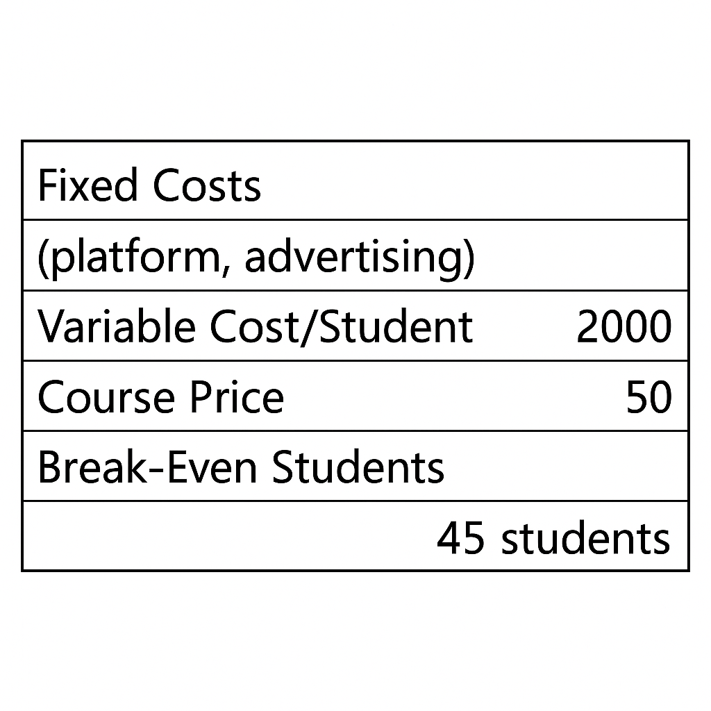 • Break-Even = 2000 / (50 – 5) = 44.44 ≈ 45 students