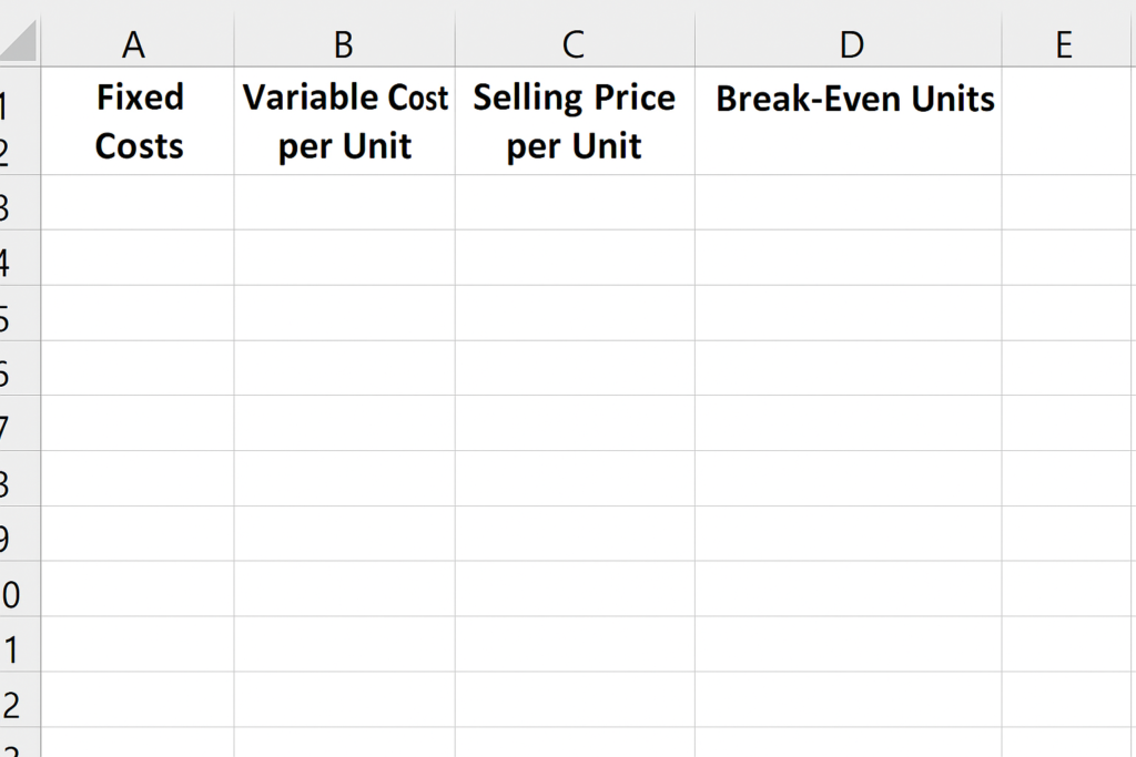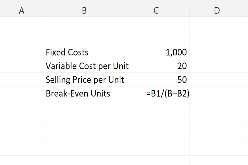 Break-Even Point (Units) = Fixed Costs / (Selling Price per Unit – Variable Cost per Unit)