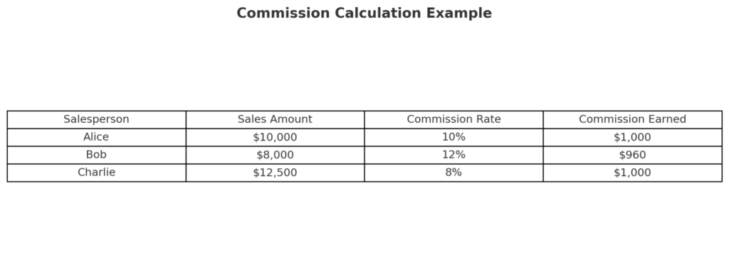 | Salesperson | Sales Amount | Commission Rate | Commission Earned |