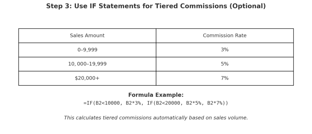 Step 3: Use IF Statements for Tiered Commissions (Optional)