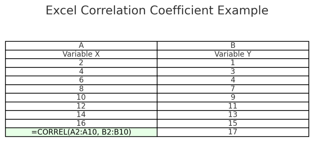 =CORREL(A2:A10, B2:B10) - Press Enter.