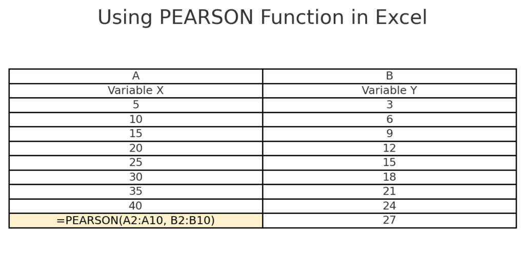 It functions similarly to =CORREL(), but is more statistical in nature.