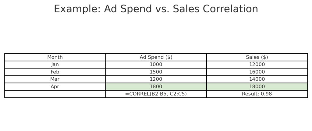 Formula: =CORREL(B2:B5, C2:C5) Result: 0.98 (strong positive correlation)