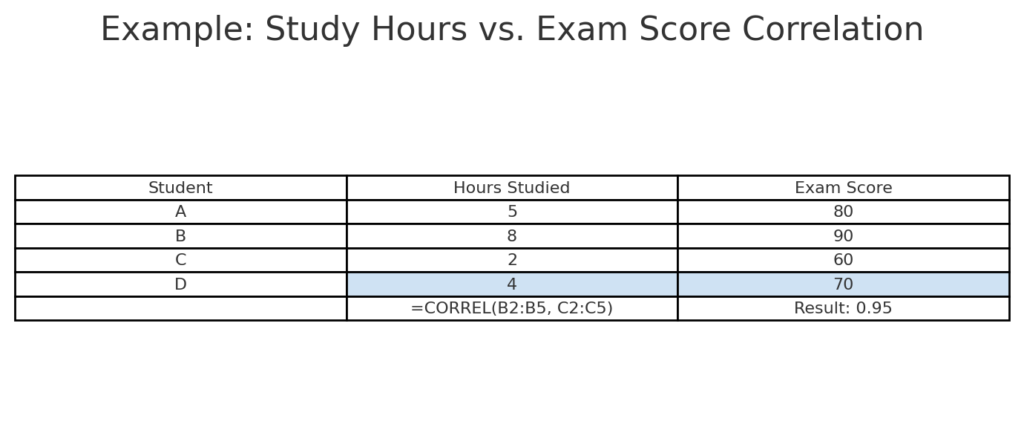 Formula: =CORREL(B2:B5, C2:C5) Result: 0.95 (strong positive correlation)