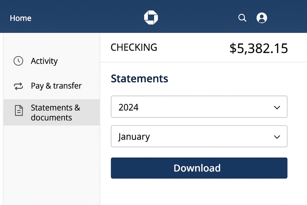 Log in to your Chase account, go to the specific account (checking, savings, or credit card), then click on ‘Statements & Documents’.