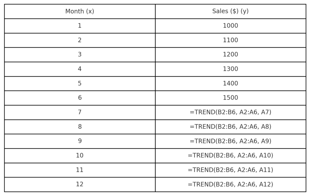 =TREND(B2:B6, A2:A6, A7:A12)
