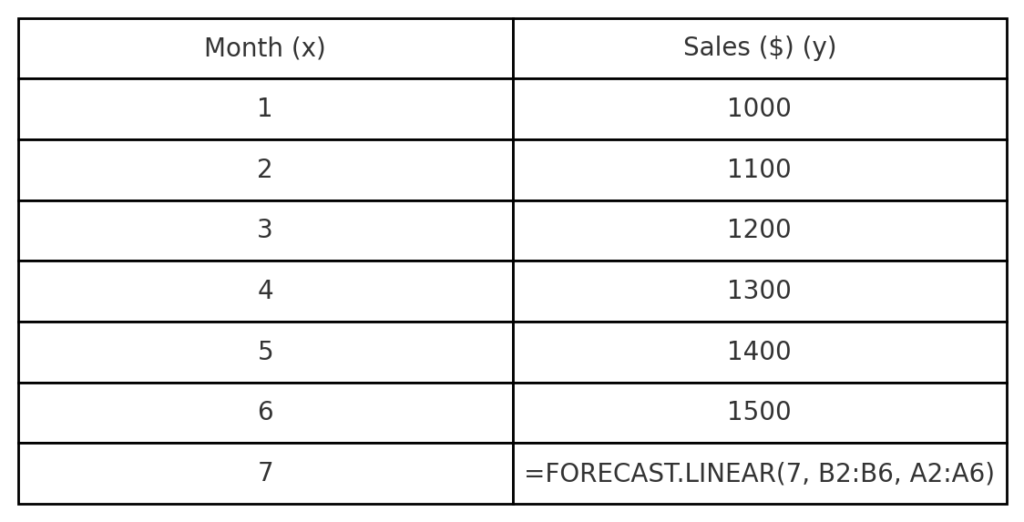 =FORECAST.LINEAR(7, B2:B6, A2:A6)