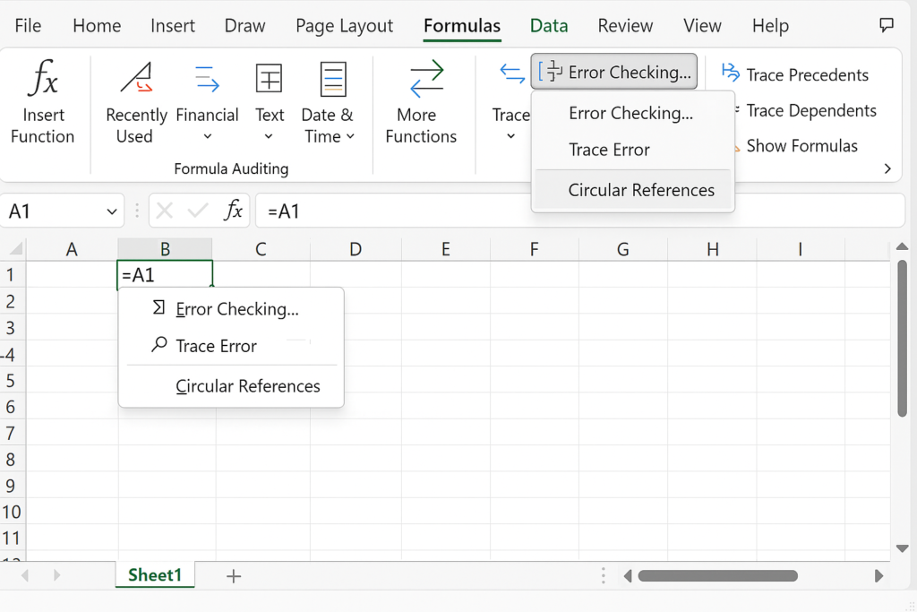 | Indirect | The loop involves multiple cells | A1 = B1 + 1 and B1 = A1 + 1 |