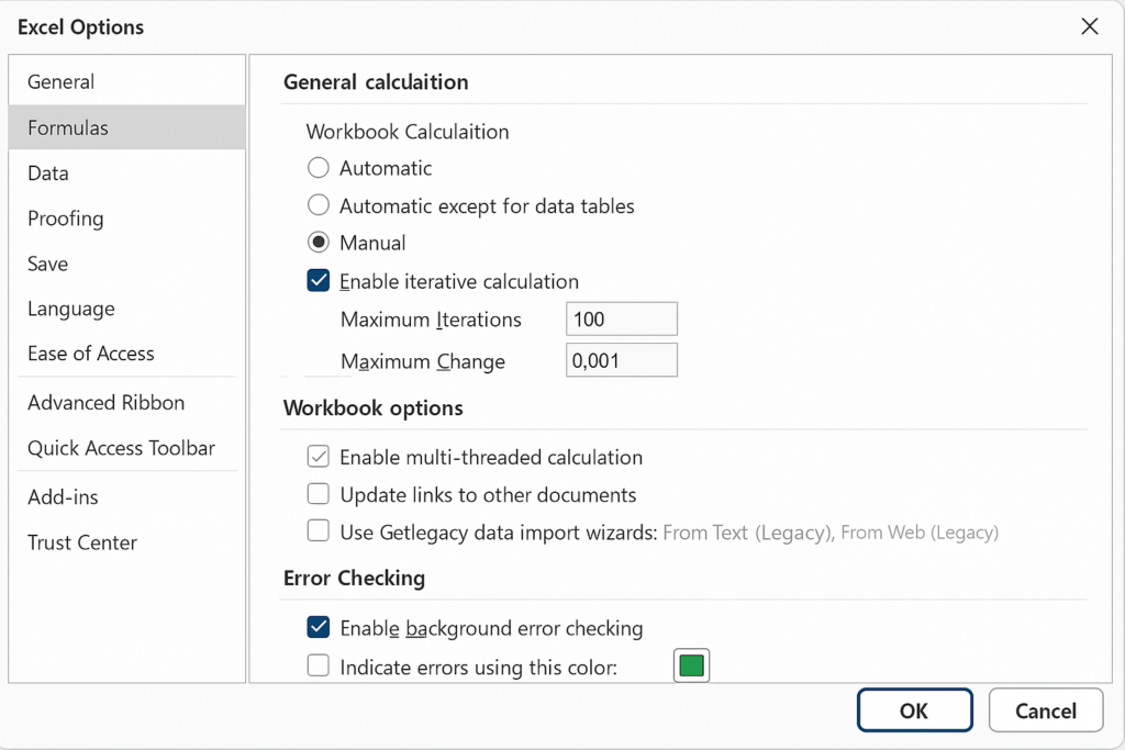 - If you’re using intentional iterations: Go to File > Options > Formulas. Check Enable iterative calculation. Set Maximum iterations and Maximum change