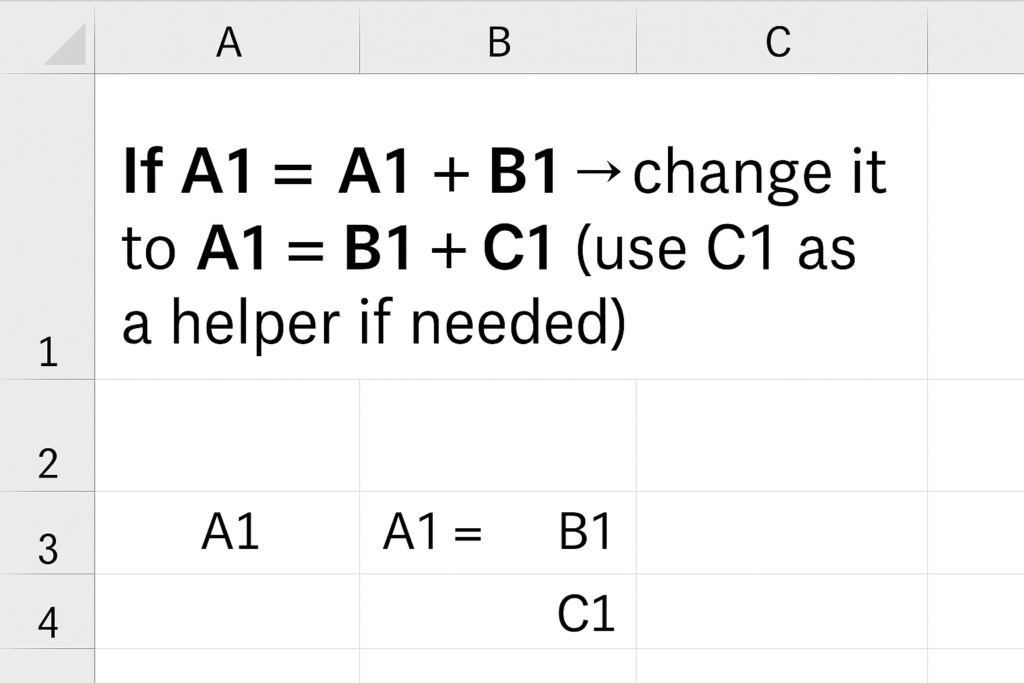 If A1 = A1 + B1 → change it to A1 = B1 + C1 (use C1 as a helper if needed)