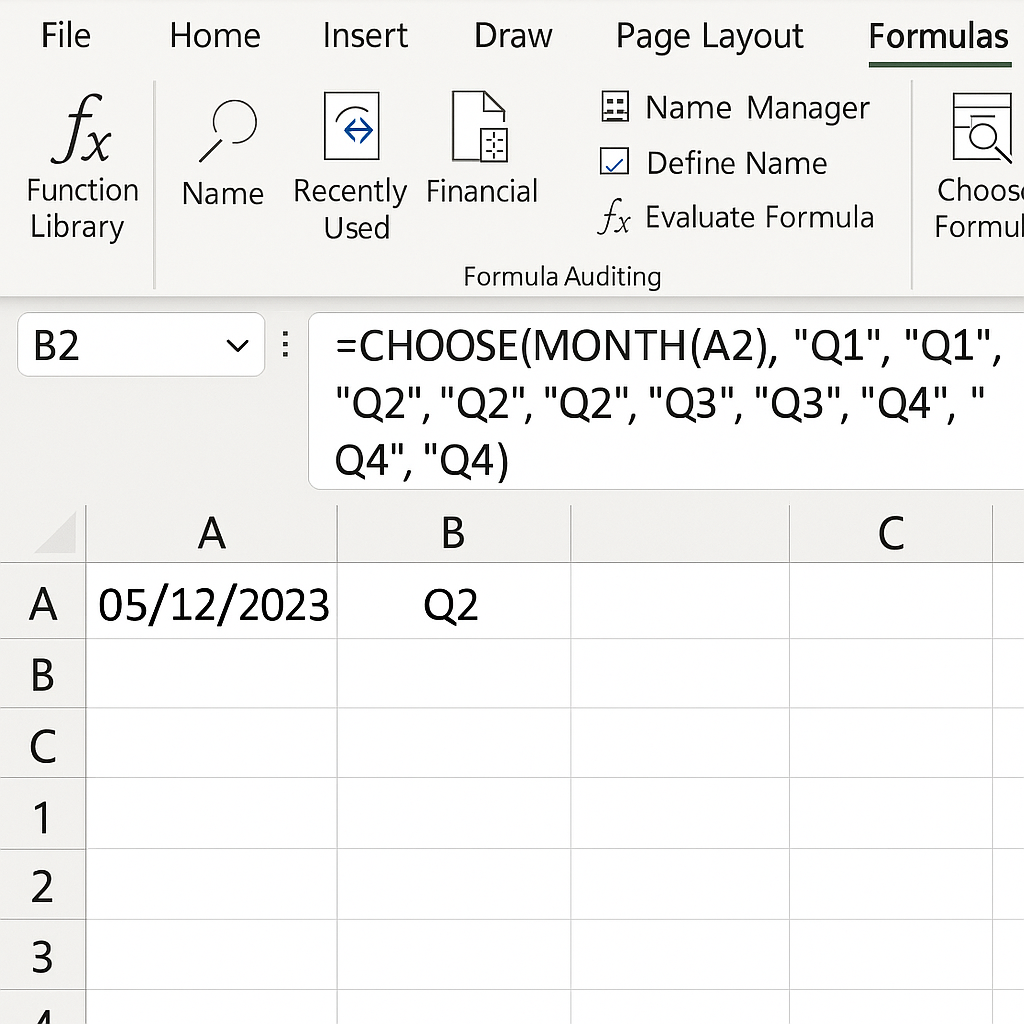 =CHOOSE(MONTH(A2), “Q1”, “Q1”, “Q1”, “Q2”, “Q2”, “Q2”, “Q3”, “Q3”, “Q3”, “Q4”, “Q4”, “Q4”)