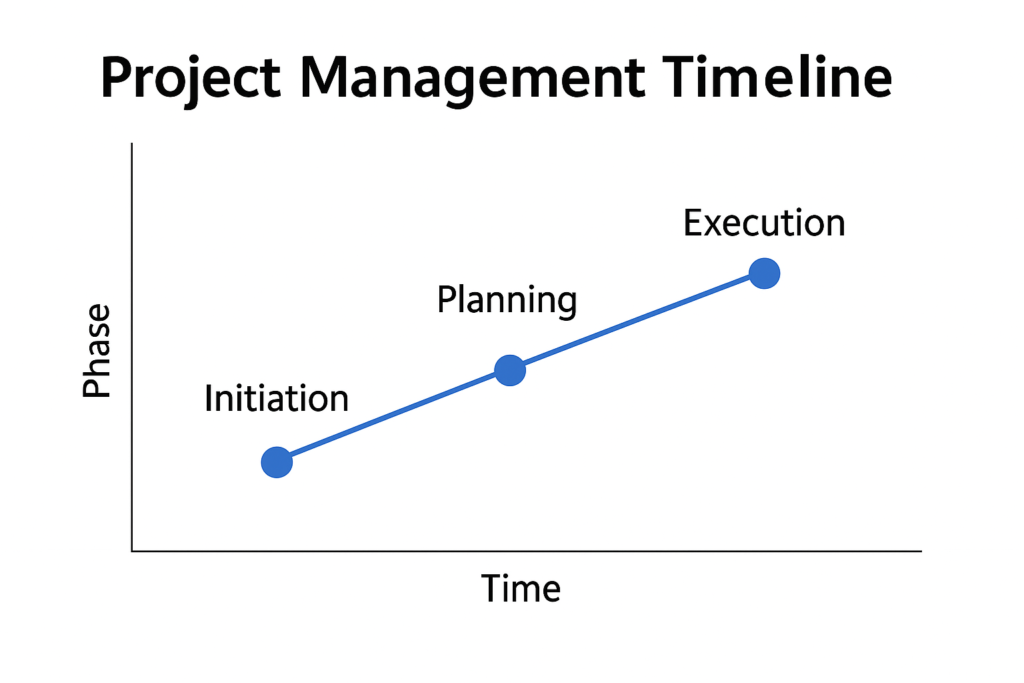 A chart showing the phases: Initiation, Planning, Execution, and Closure. It includes milestone markers for each phase.