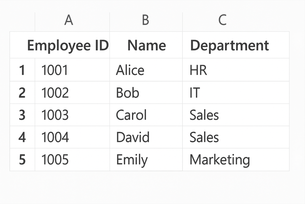 Result: | A (Employee ID) | B (Name) | C (Department) |