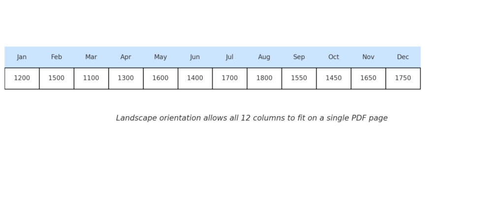 You have a monthly report with 12 columns (Jan–Dec) that would be hard to read in portrait mode. By setting the orientation to landscape, each column fits neatly on one page in the PDF.