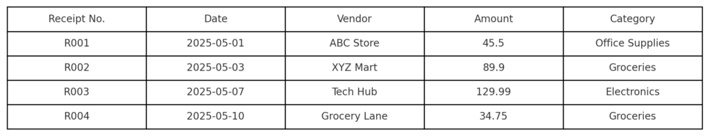 - Adjust columns for clarity (e.g., Date, Vendor, Amount, Tax, Total).