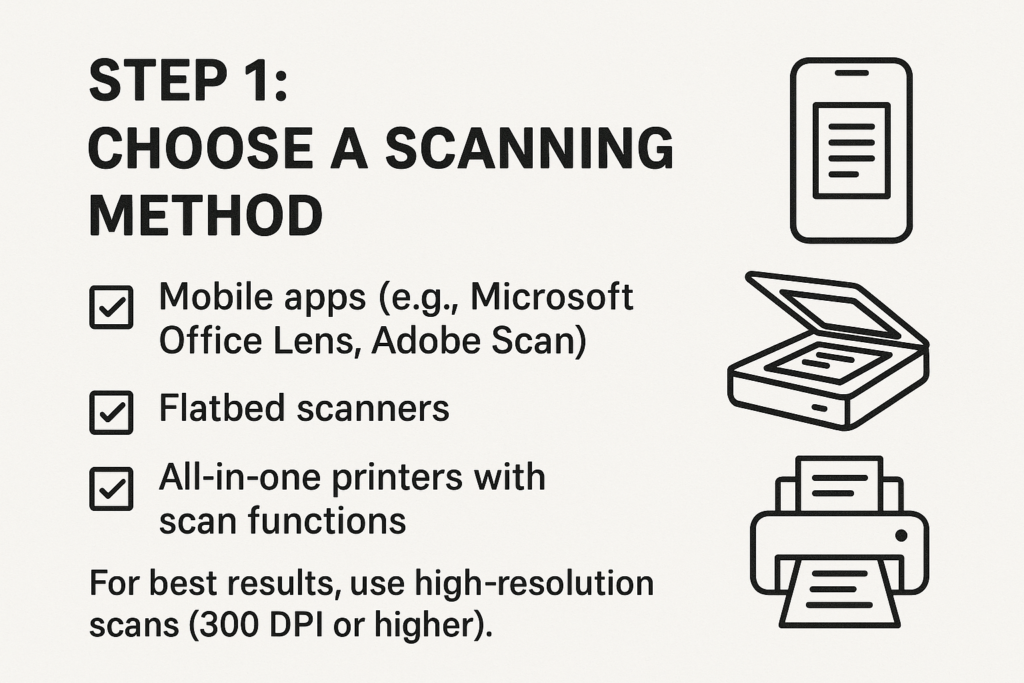 - Mobile apps (e.g., Microsoft Office Lens, Adobe Scan)