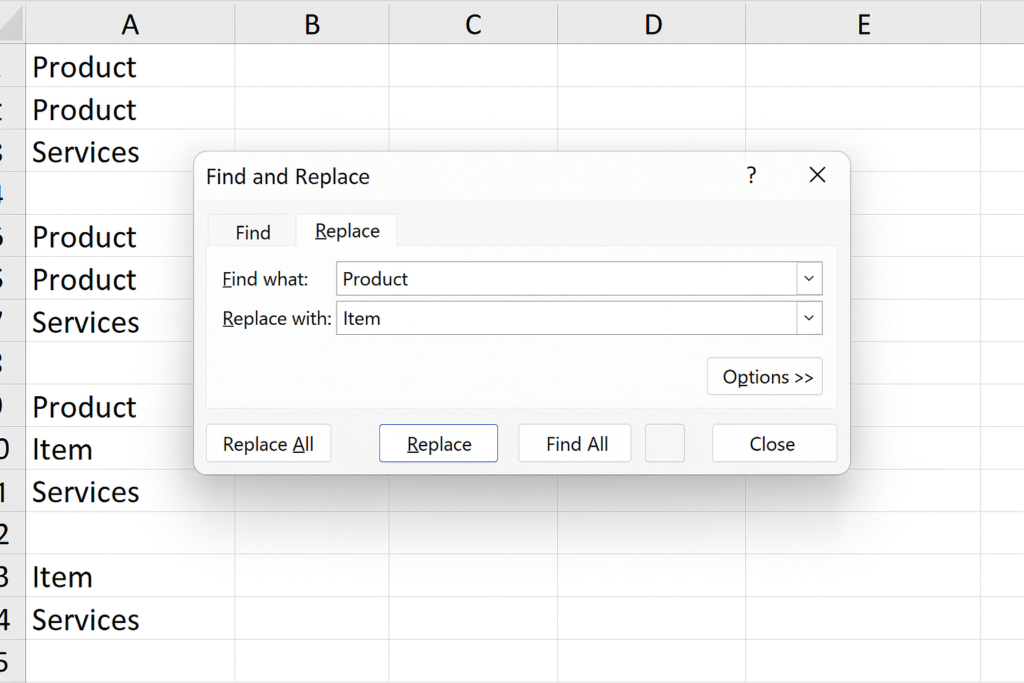 Example: Replace old product names or codes across all sheets in one go.