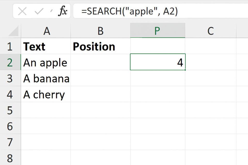 =SEARCH(“apple”, A2)