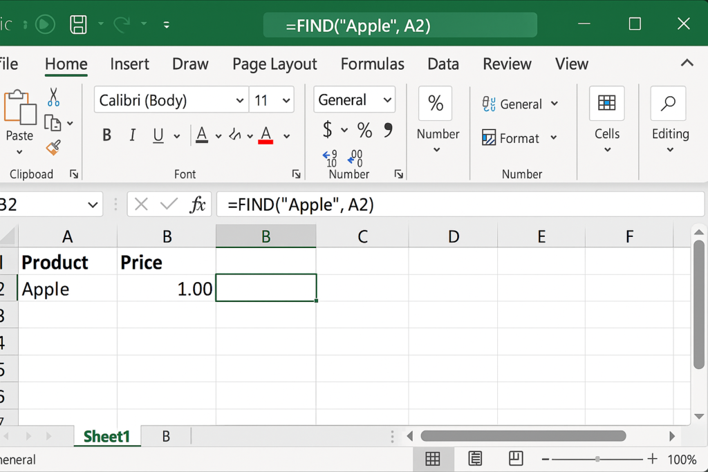 =FIND(“Apple”, A2)