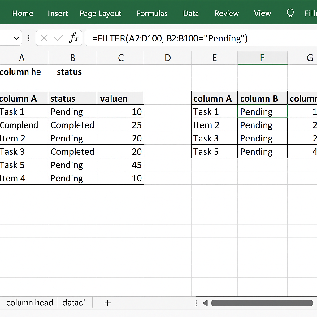 =FILTER(A2:D100, B2:B100=”Pending”)