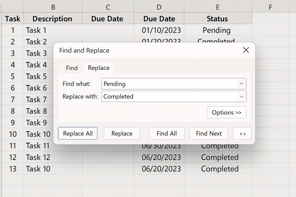 • Find what: “Pending”, Replace with: “Completed”.